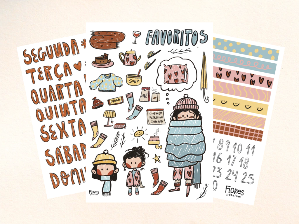 Essas cartelas foram feitas dentro do Clube de Assinatura Flores Petalum, os assinantes recebem um pacotinho em casa todo mês com artes exclusivas e autorais para serem utilizadas no bujo, planner! E ainda, tem pacotinho com material artístico pra você testar e arriscar nas criações. Conheça o Clube hoje.